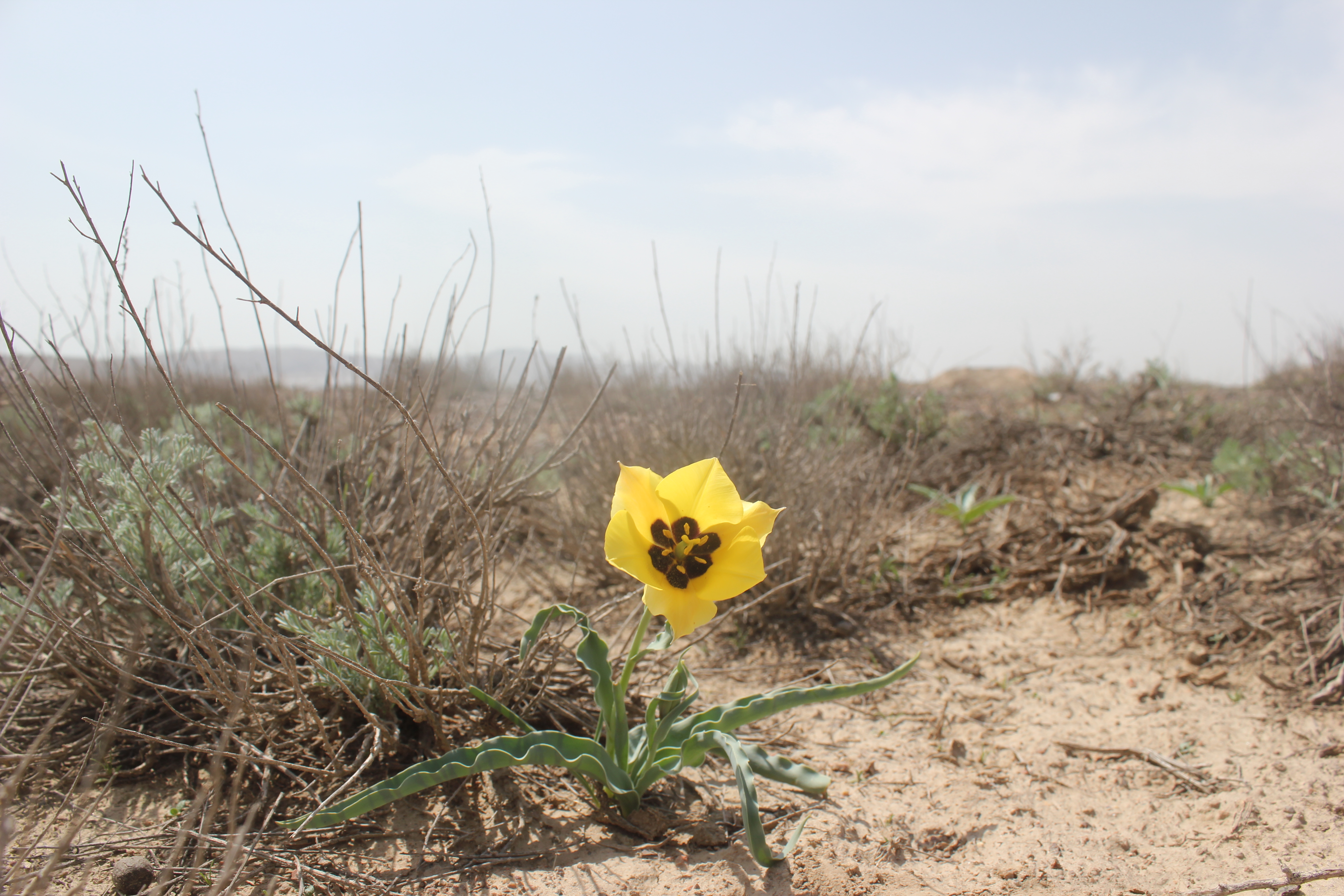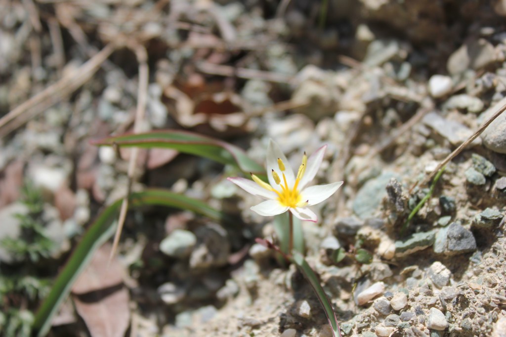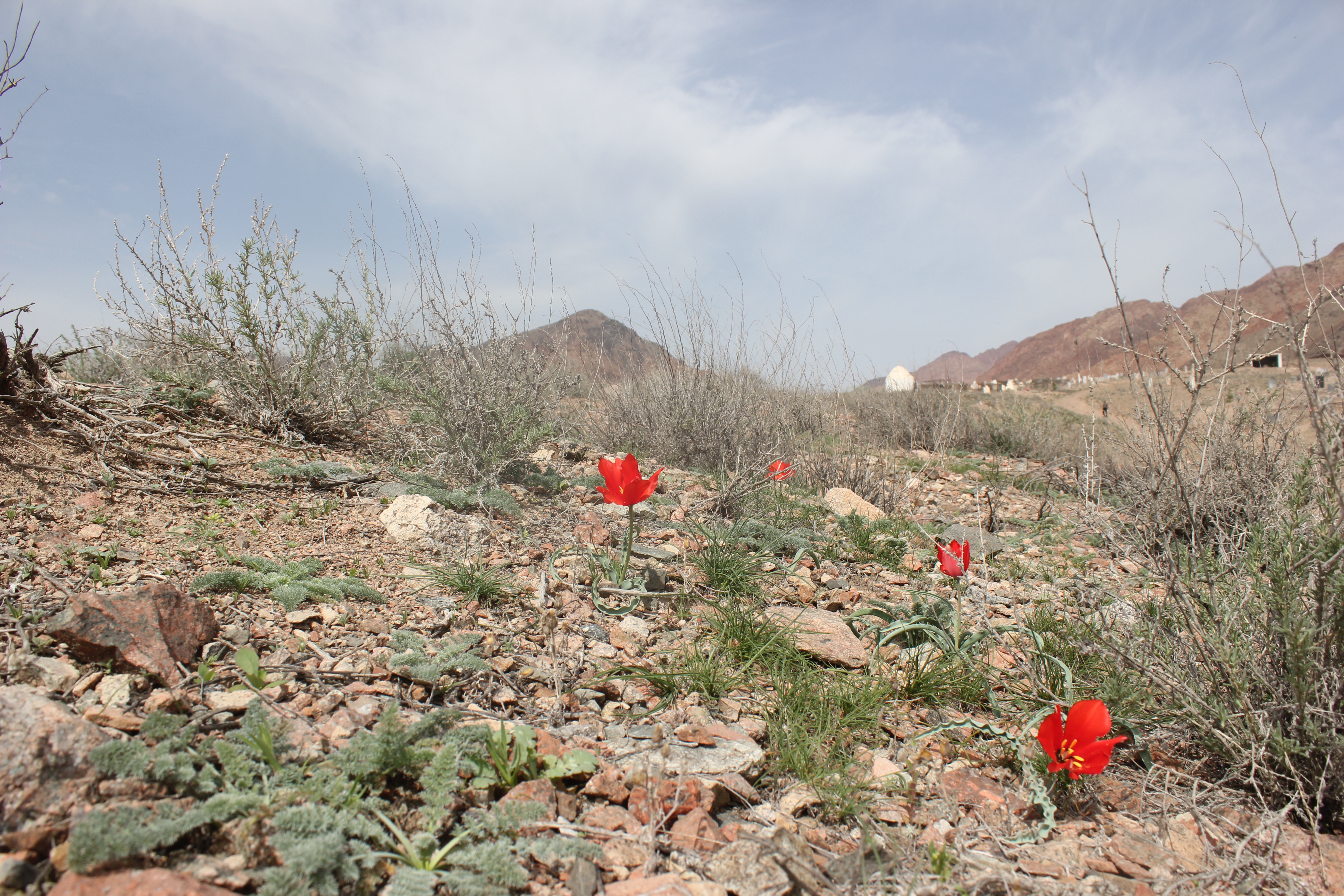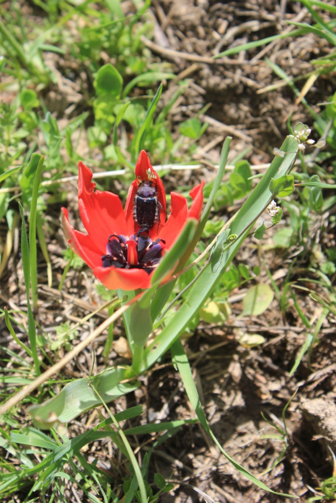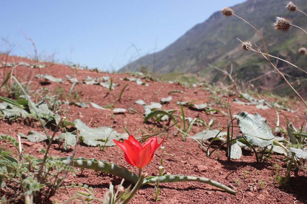 Kulob is the third largest city in Tajikistan and is in the Khatlon region in the south of the country. We crossed some pretty magnificent mountains on our way to this city, before winding through the vast open areas where cotton is grown, and as the light faded, we arrived at our destination. Mario’s brother had prepared some food for us as my team was fasting for Ramadan, so they broke their fast on arrival before we retired back to Mario’s house in the grounds of the Kulob Botanical Garden. The next day, we set out early heading about an hour north of Kulob to some hills, which I would later realise were small mountains. Climbing up from a small village in the valley bottom we rose to the rolling hills and pastureland at the top and stumbled across the flowering Tulipa maximowiczii, currently not thought to be a true species, but a synonym of Tulipa linifolia. Despite this, its remarkable red flower with distinct blotch were a great spectacle. We also found a few flowers of the large red flowering species Tulipa praestans as well as some evidence of Tulipa subquinquefolia, whilst being beadily watched by a circling eagle. Not a bad first day.