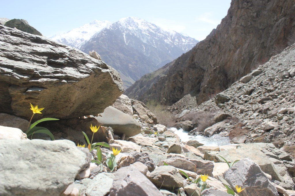 On the second day we drove to the Darvoz region, skirting the border of Afghanistan and dominated by huge mountains and deep valleys. It took us nearly three hours to reach the valley where we were going to explore, but this flew by as I watched Afghans going about their lives on the other side of the river border, which at some points was only 50m away. We hiked up into a steep gorge with the weather becoming increasingly hot, the temperature touching 30 degrees. On our way, we found populations of the little white Tulipa turkestanica, the red and yellow flowering forms of Tulipa linifolia, and the beautiful yellow flower of Tulipa anisophylla hiding about two hours up into the gorge. As we headed back down the same gorge with the rushing water from melting snow bubbling beside us, we were treated to incredible views of the Hindu Kush Mountains of Afghanistan. Tulips truly grow in some of the most spectacular places.