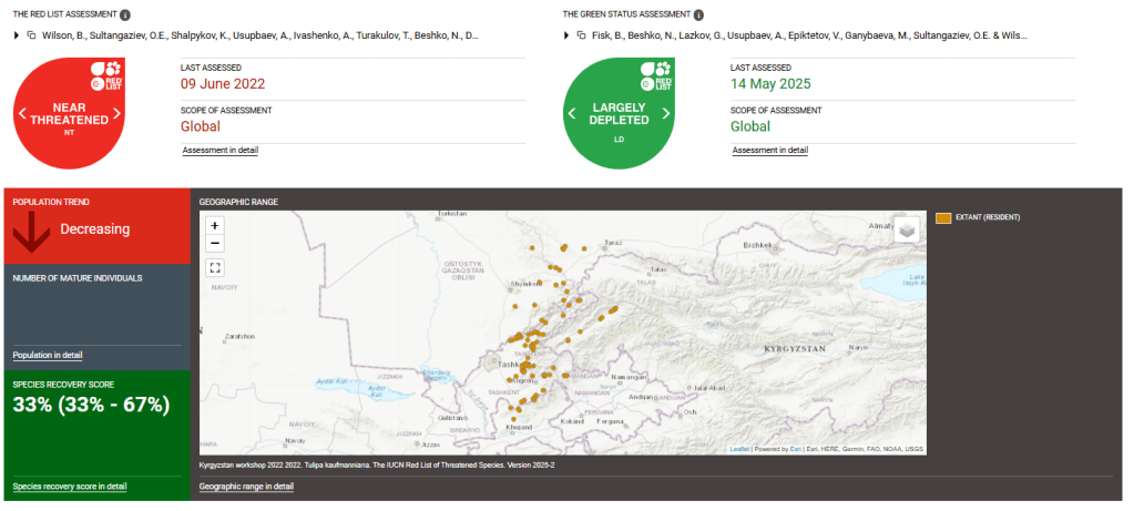 Applying the Green Status of Species to tulips has of course come with challenges. There is a myriad of data gaps for tulips with many species still under-studied; quantifying the role of tulips in ecosystems is difficult; identified ancestral areas may no longer be restorable due to agriculture or development; rising temperatures and shifting rainfall patterns due to climate change add another layer of complexity. Nonetheless we have shown that with perseverance and expert knowledge tulips can be assessed using the Green Status of Species process, and that this tool adds a crucial new perspective on tulip conservation.