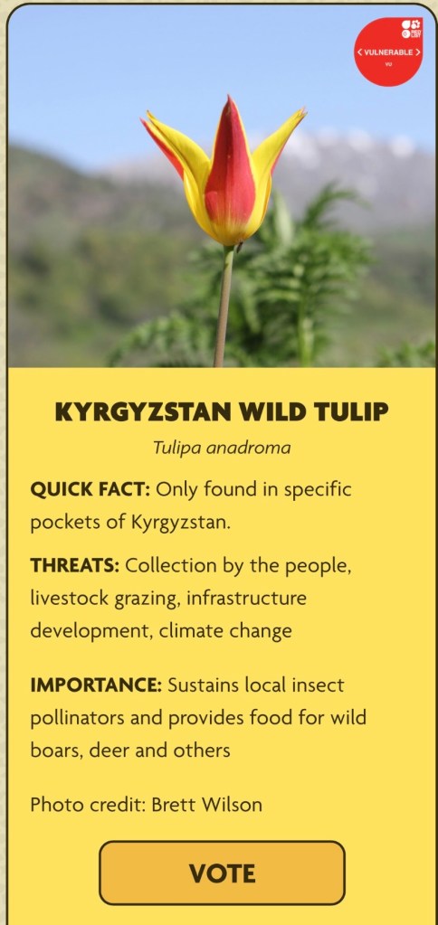 The plant conservation community also played a pivotal role. Organisations such as BGCI, Cambridge University Botanic Gardens, the RHS, and the Royal Botanic Gardens Kew provided invaluable support, helping to extend the reach of the campaign far beyond immediate networks. Moreover, from the very beginning through to the final stages of the competition, the strong support of members of the IUCN SSC Wild Tulip Specialist Group was invaluable. Their efforts to mobilize people in their respective countries through social media, peer-to-peer communication, and targeted outreach played a crucial role. Members mobilised quickly, drawing on their deep commitment to the genus and its conservation emphasising the power of this collaborative community for global efforts to protect wild tulips. This support was further strengthened by engagement from other plant-focused Specialist Groups, including the Orchid Specialist Group, creating a strong sense of solidarity across the plant conservation community and reinforcing the IUCN SSC’s critical role in supporting conservation efforts. In a field that often struggles for visibility, this collective backing was both powerful and deeply encouraging.